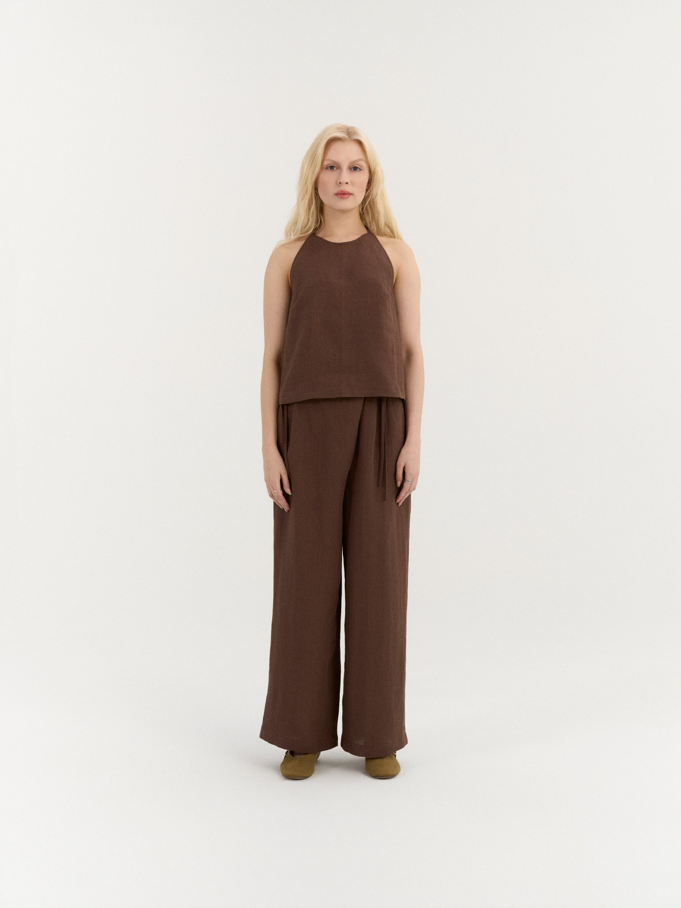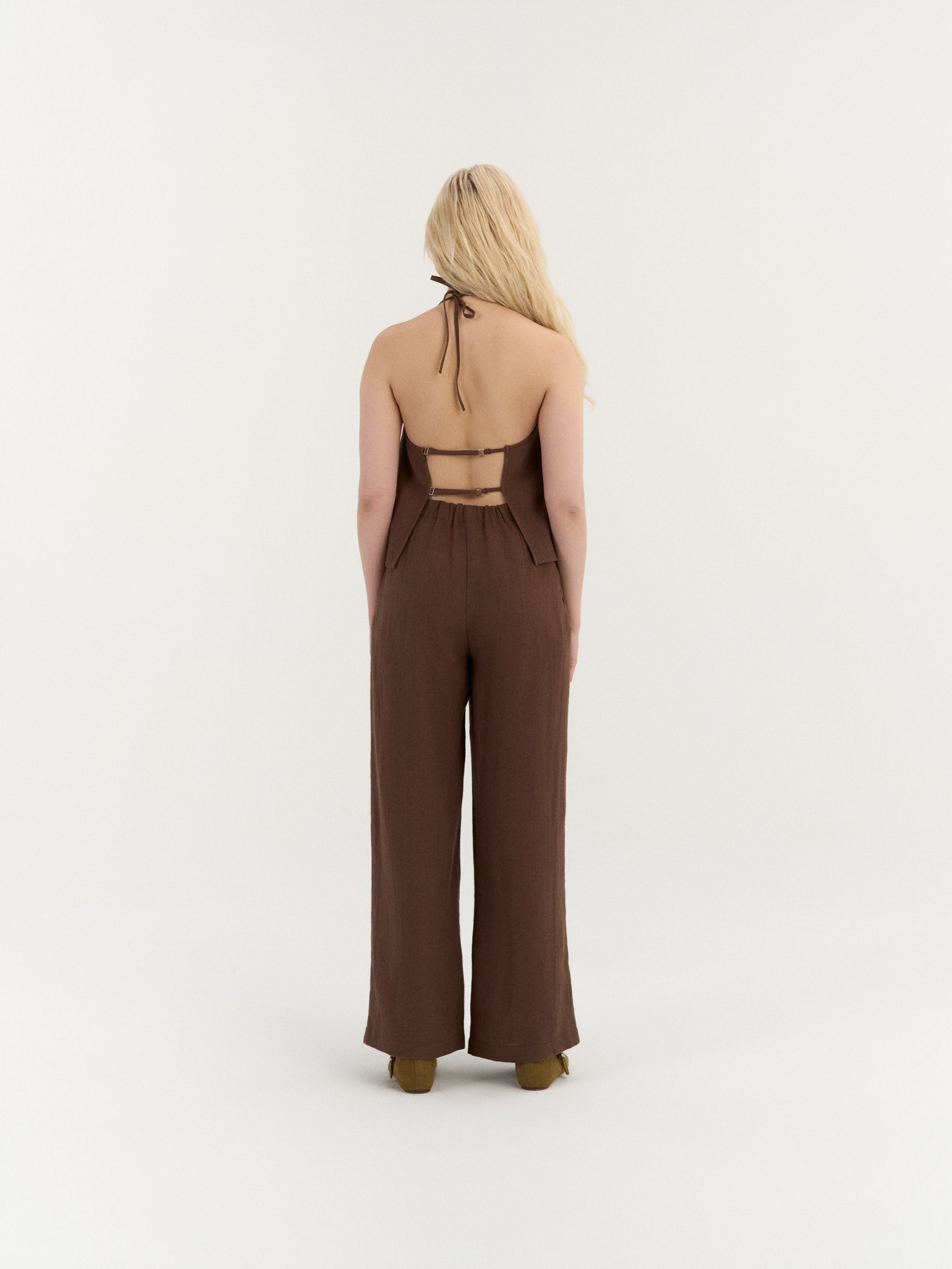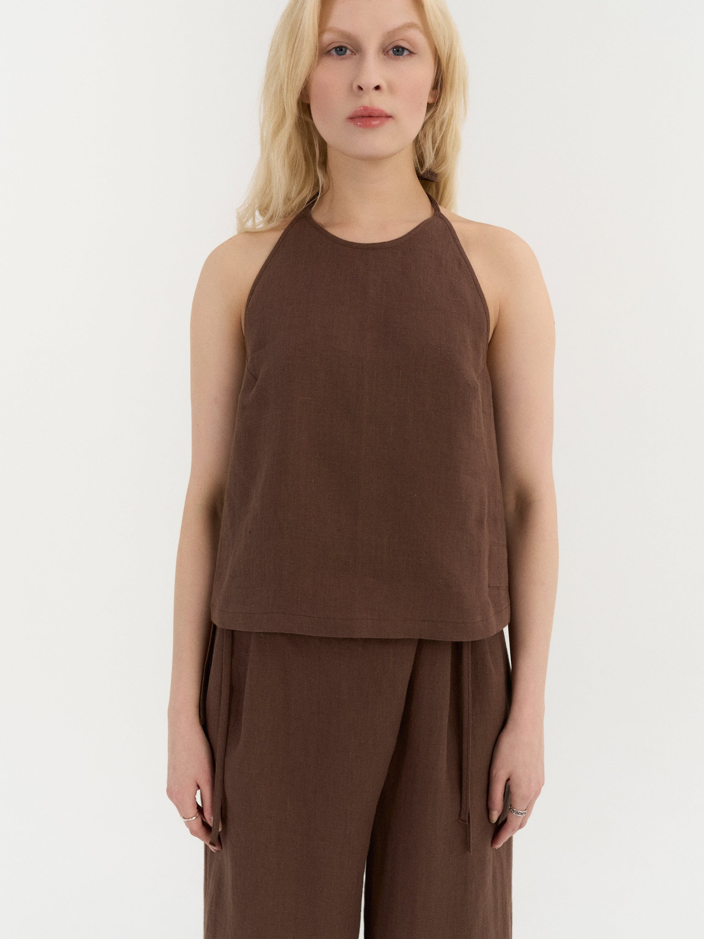 A relaxed halter-neck top with a softly flowing silhouette and an open back design. The neckline ties at the back of the neck, while two adjustable back straps create a delicate, minimal structure and allow for a comfortable fit.