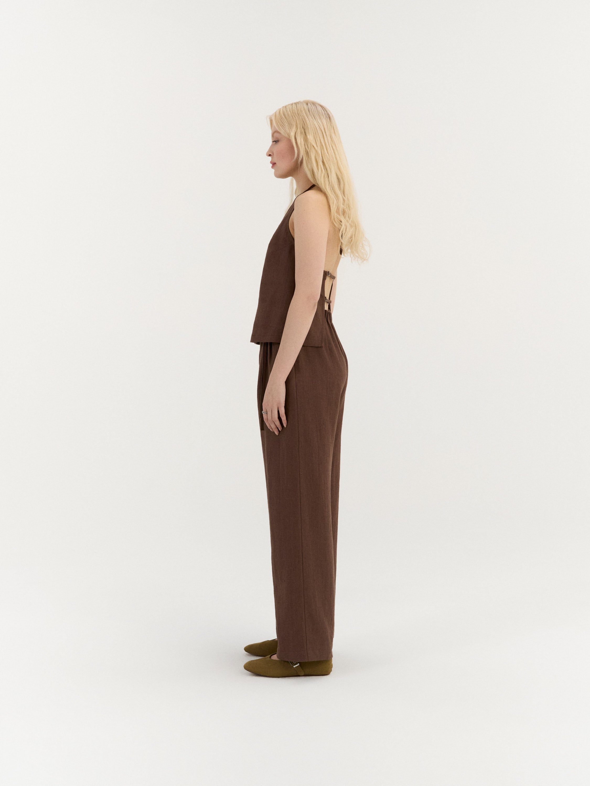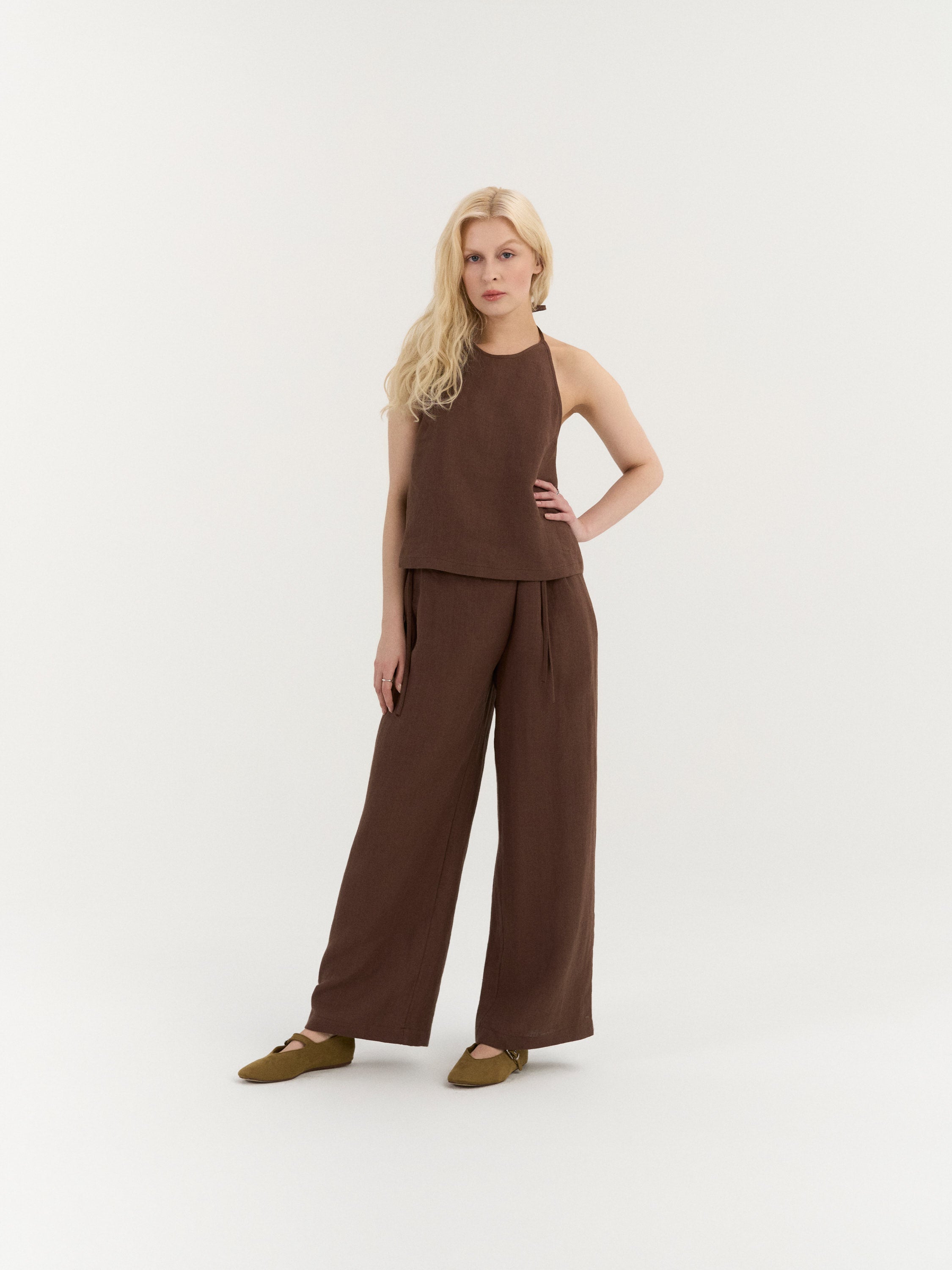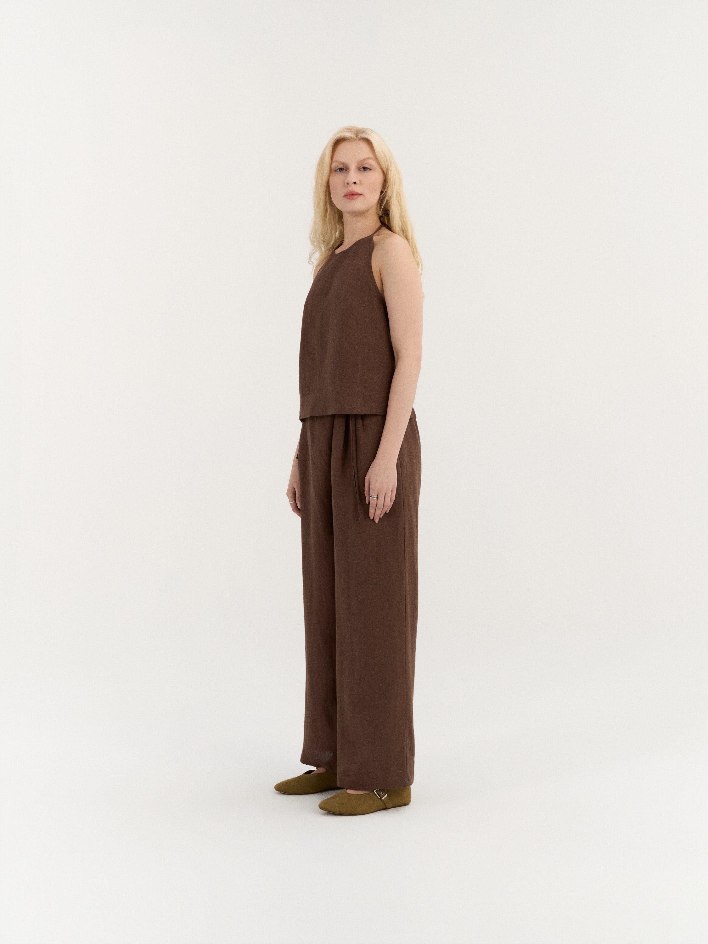 A relaxed halter-neck top with a softly flowing silhouette and an open back design. The neckline ties at the back of the neck, while two adjustable back straps create a delicate, minimal structure and allow for a comfortable fit.