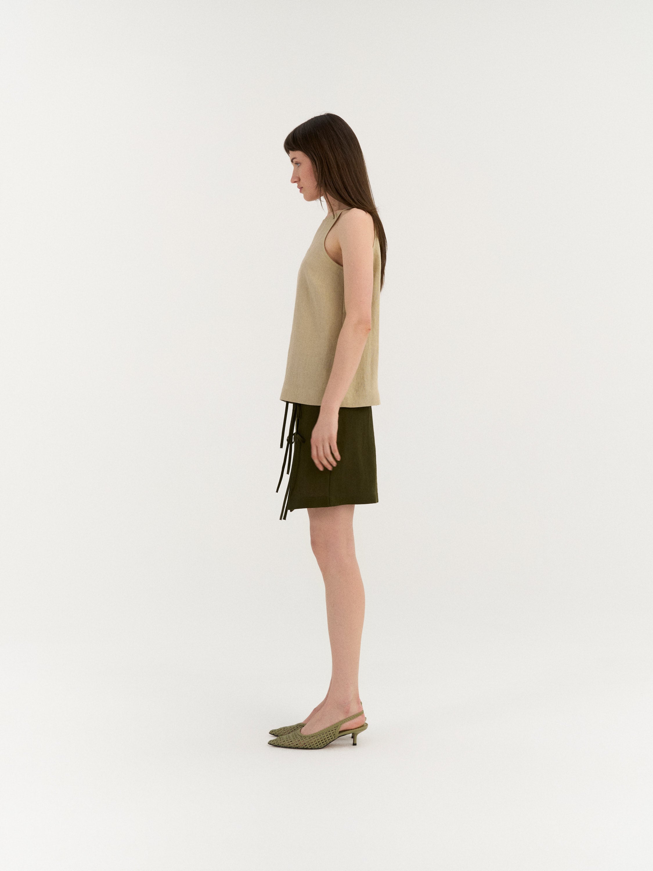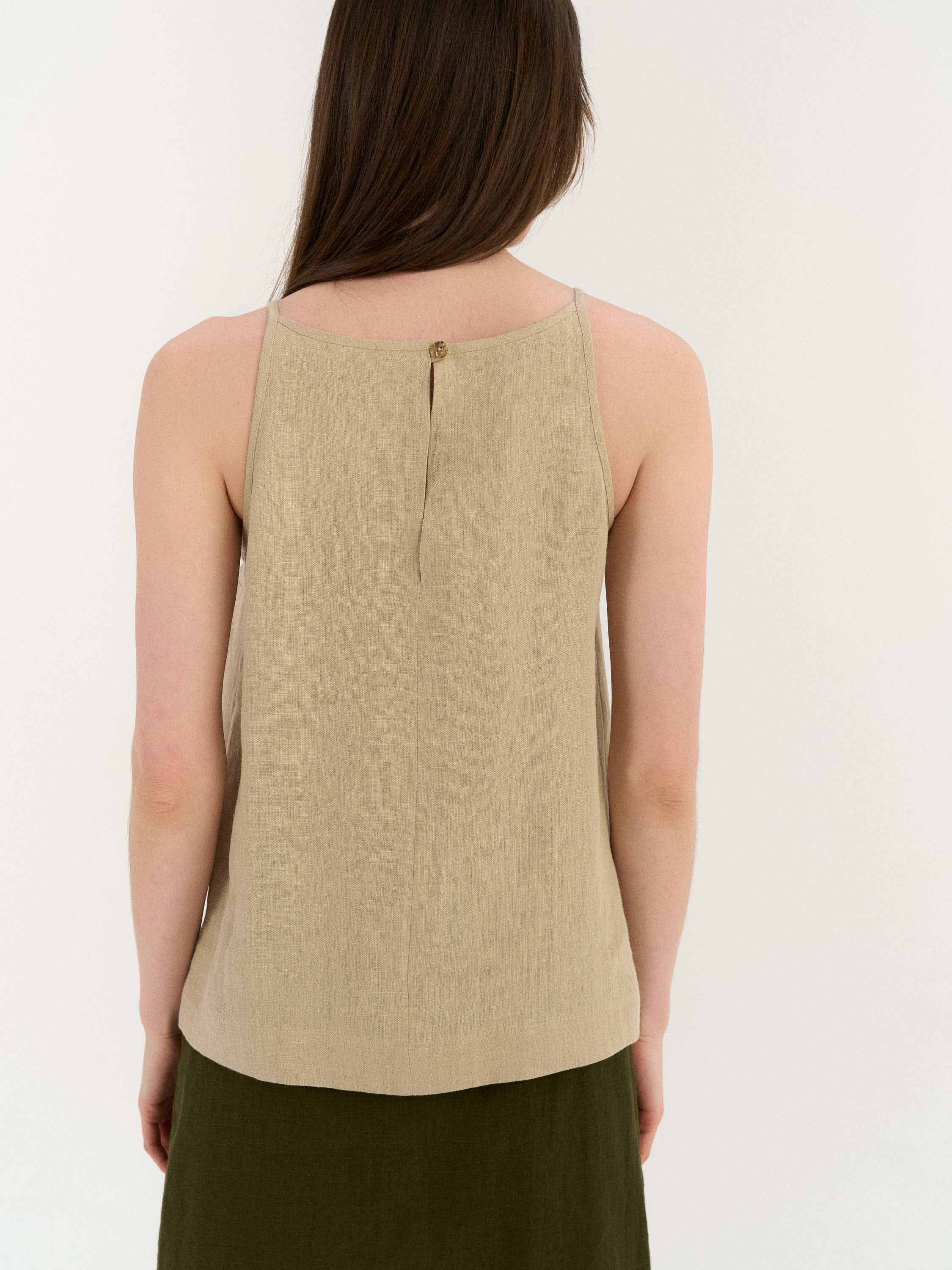 Sleeveless top with a clean, slightly A-line silhouette. The design features a high neckline with narrow shoulder straps and a smooth front. The back is finished with a small button closure and a subtle slit below the neckline. Cut to a relaxed fit with a gently curved hem.