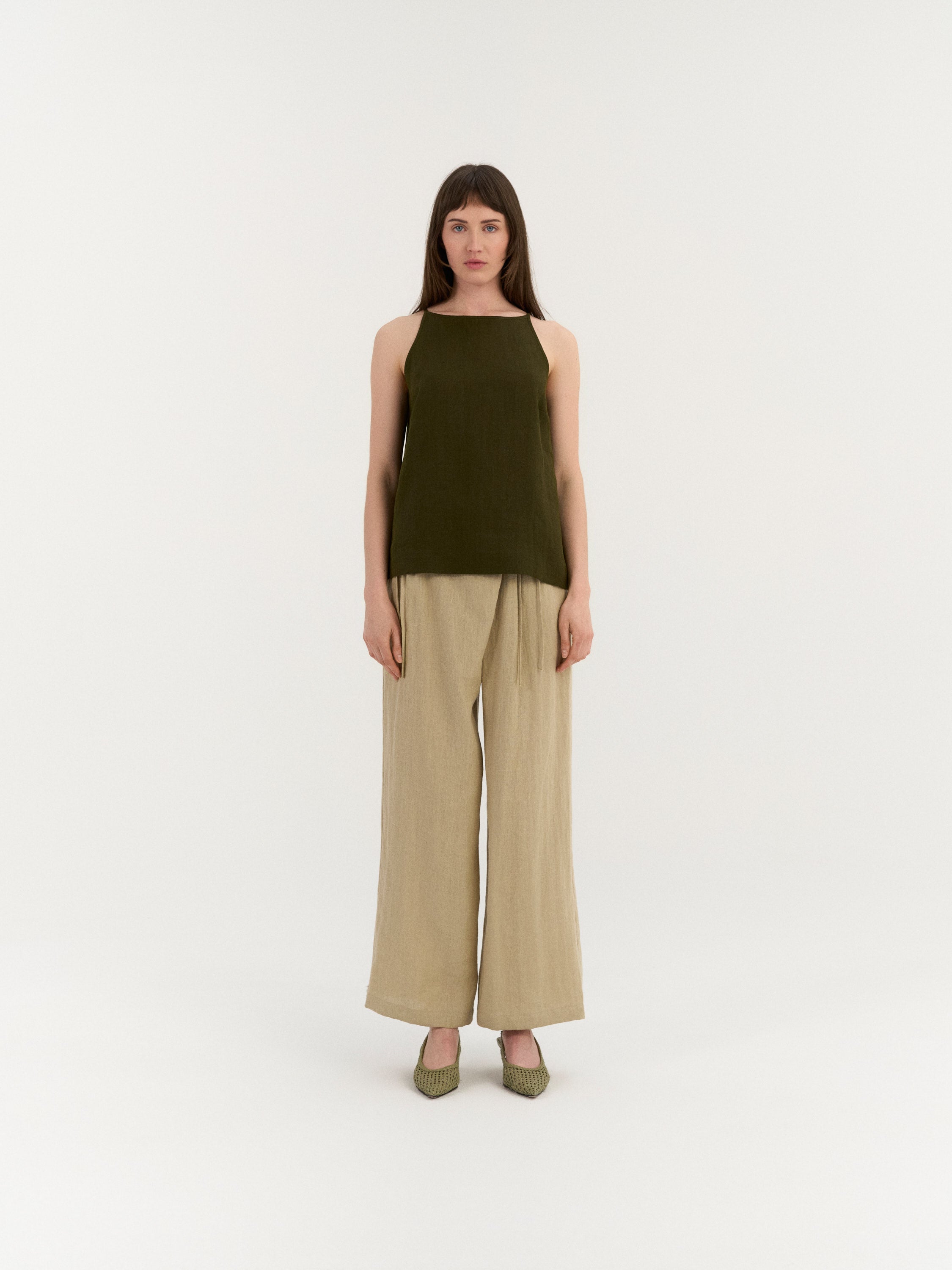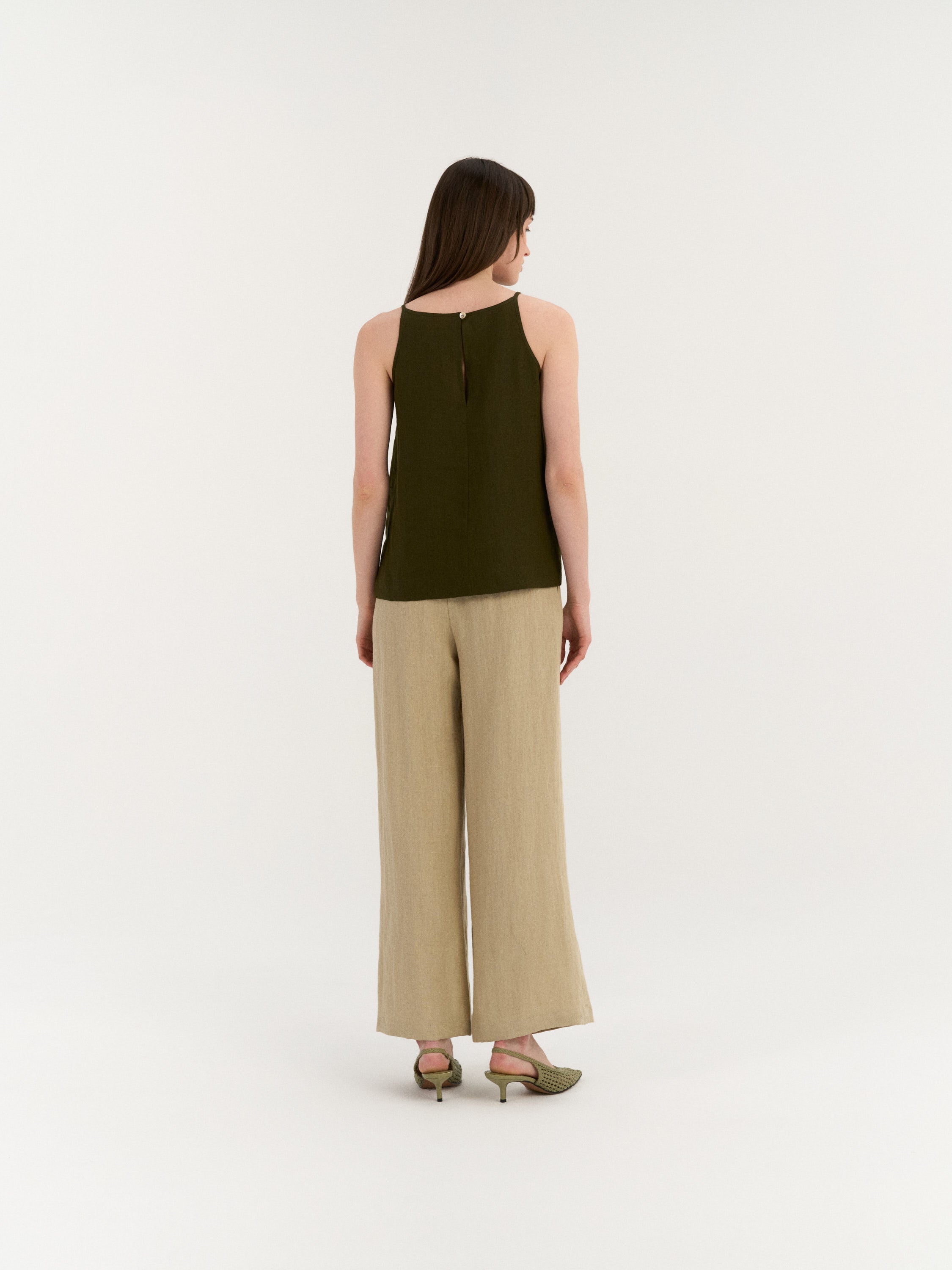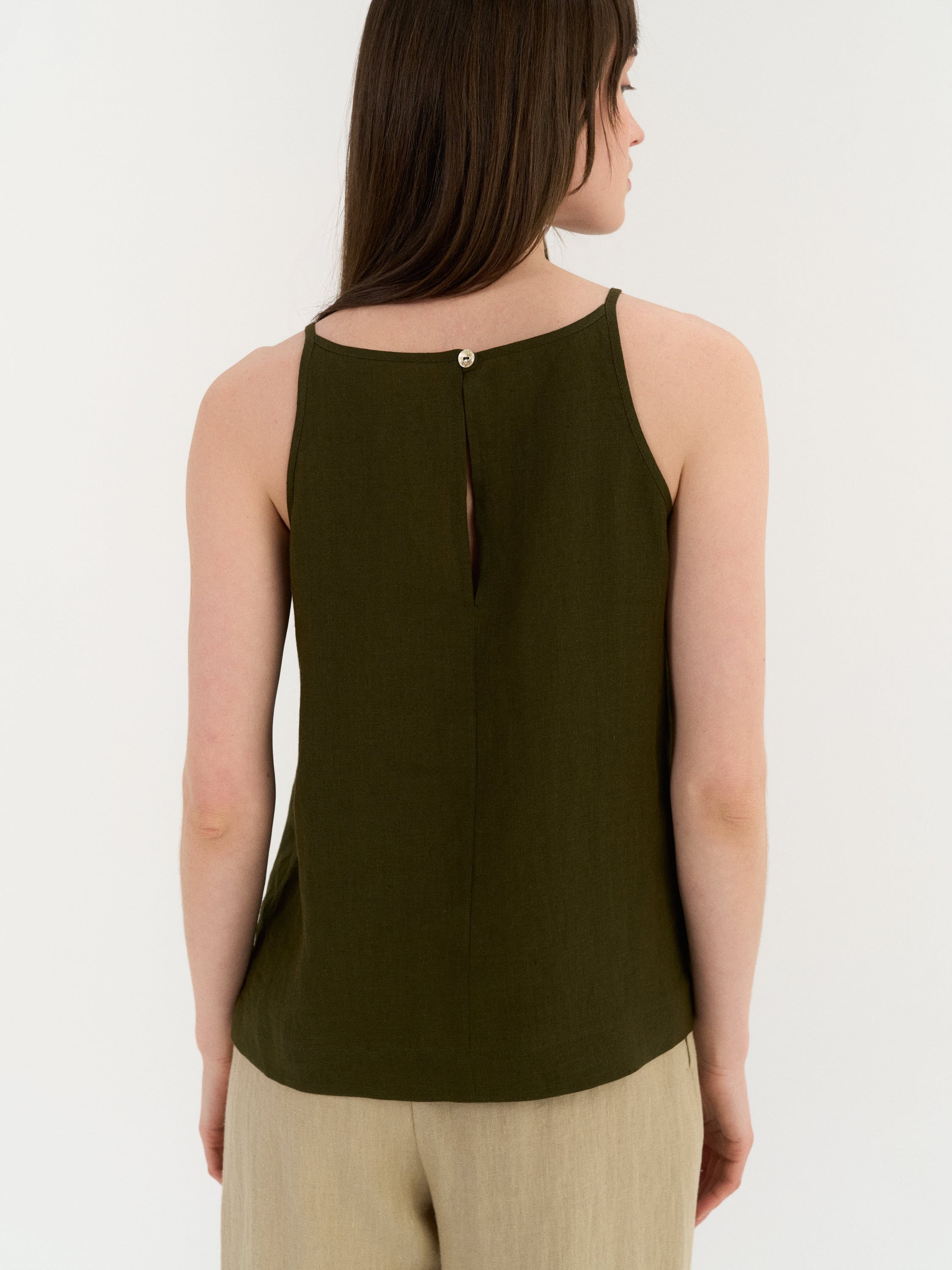 Sleeveless top with a clean, slightly A-line silhouette. The design features a high neckline with narrow shoulder straps and a smooth front. The back is finished with a small button closure and a subtle slit below the neckline. Cut to a relaxed fit with a gently curved hem.
