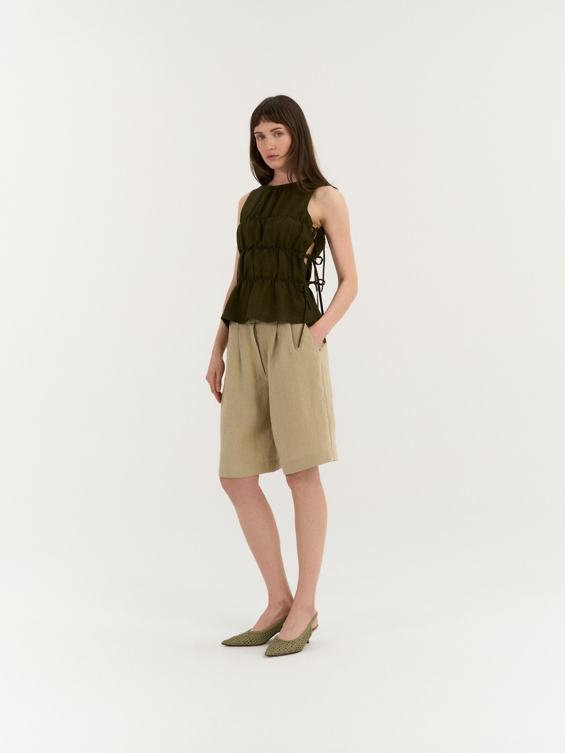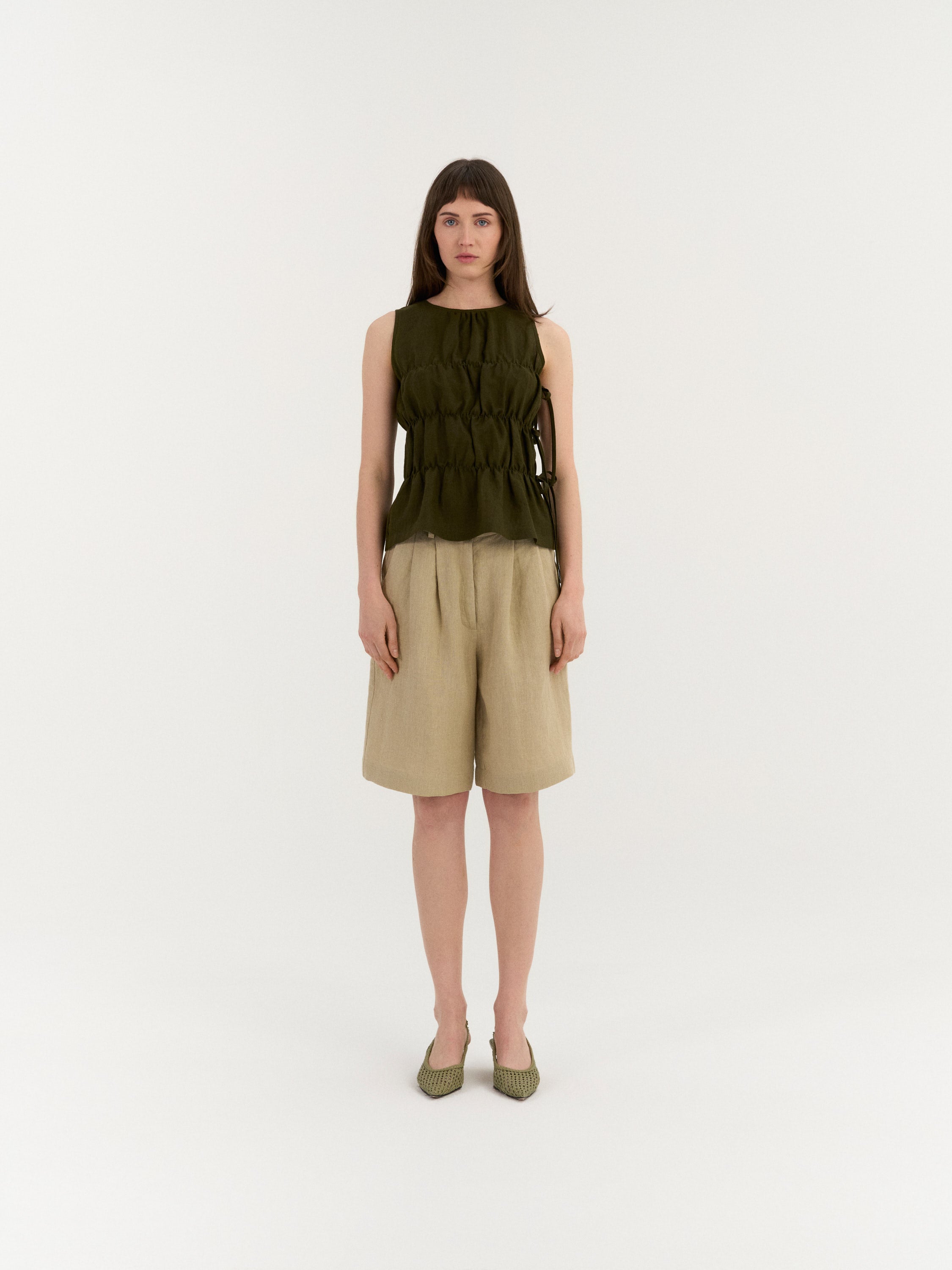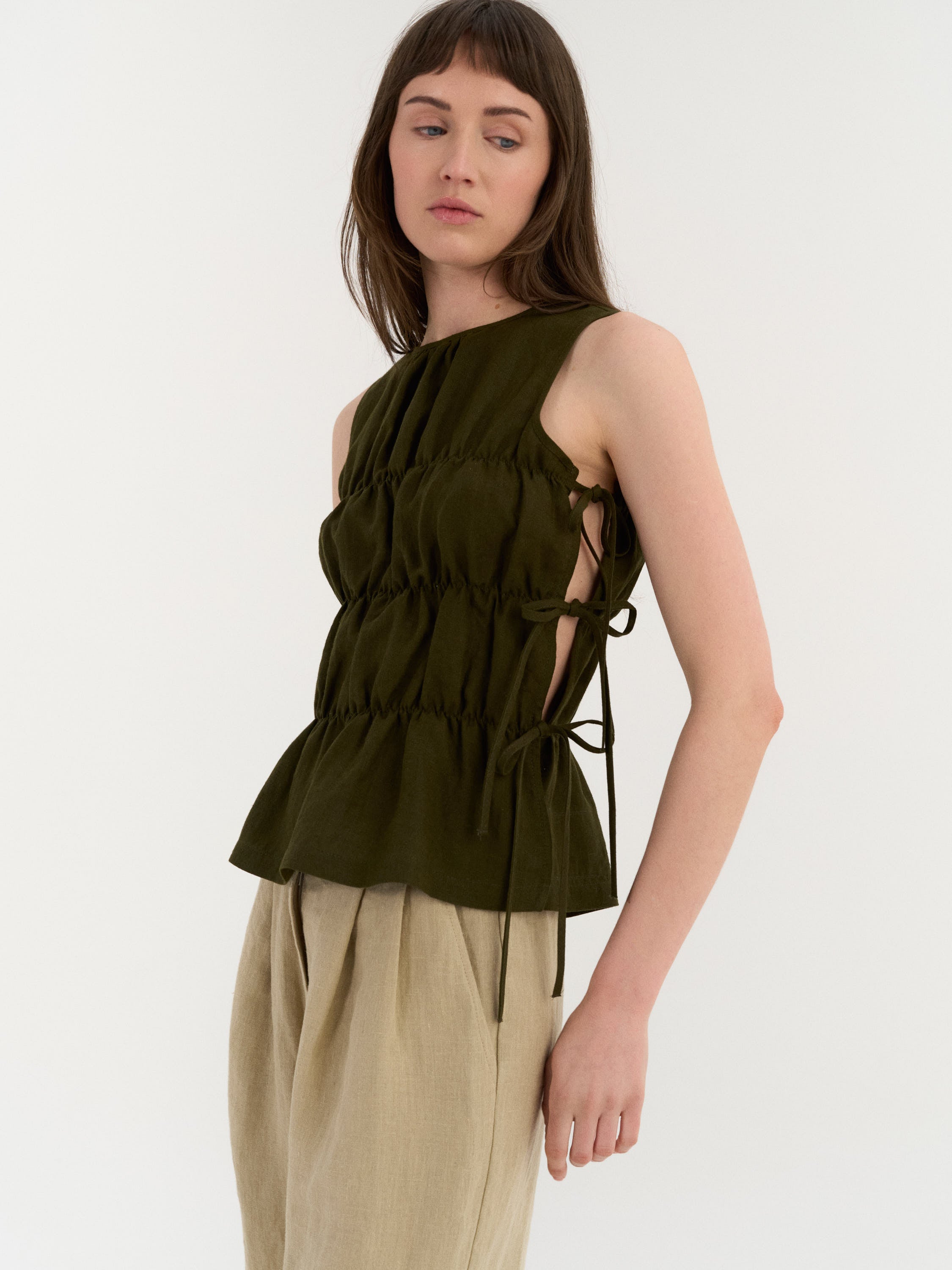 Sleeveless top with a high neckline and softly gathered panels that create texture and volume. The sides feature adjustable tie closures that allow the fit to be customized while adding an open, airy detail.