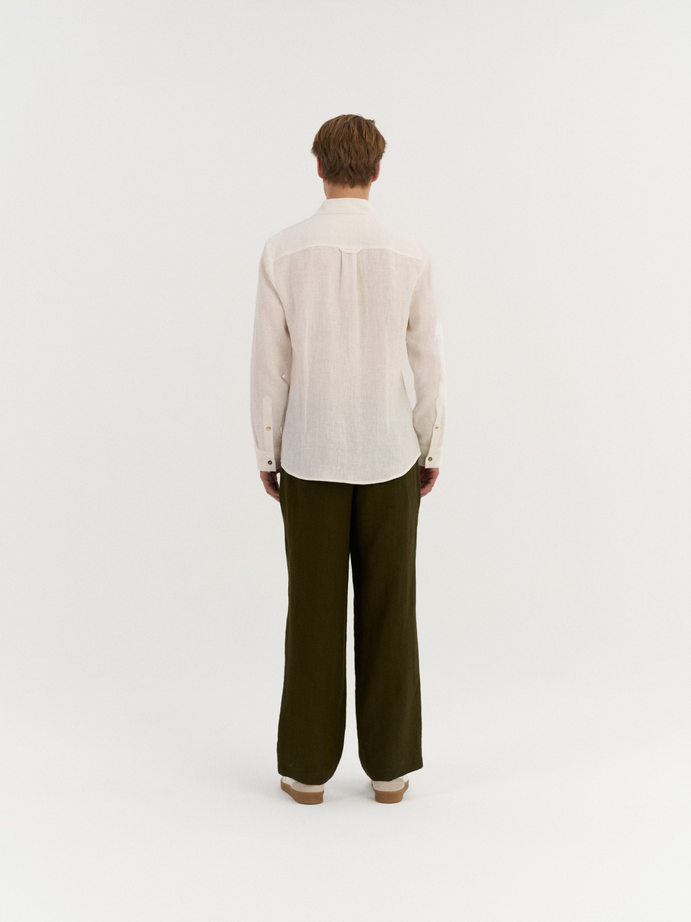 Long-sleeve shirt with a classic collar and a button-front closure. The design features a single chest patch pocket and a back yoke with a central pleat for added ease of movement. Finished with buttoned cuffs and a gently curved hem.